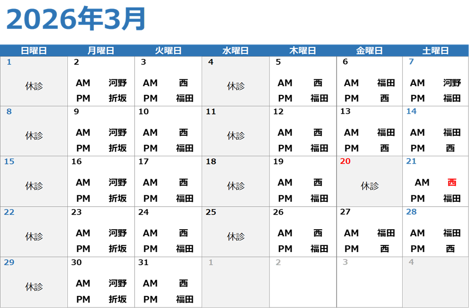 3月21日(土)の午前中の診療は、西院長に変更となりました。